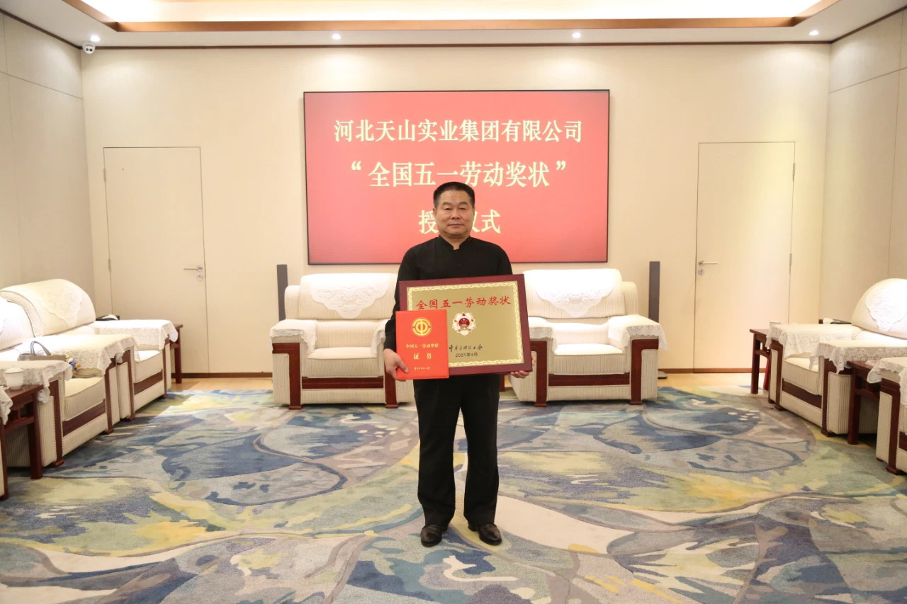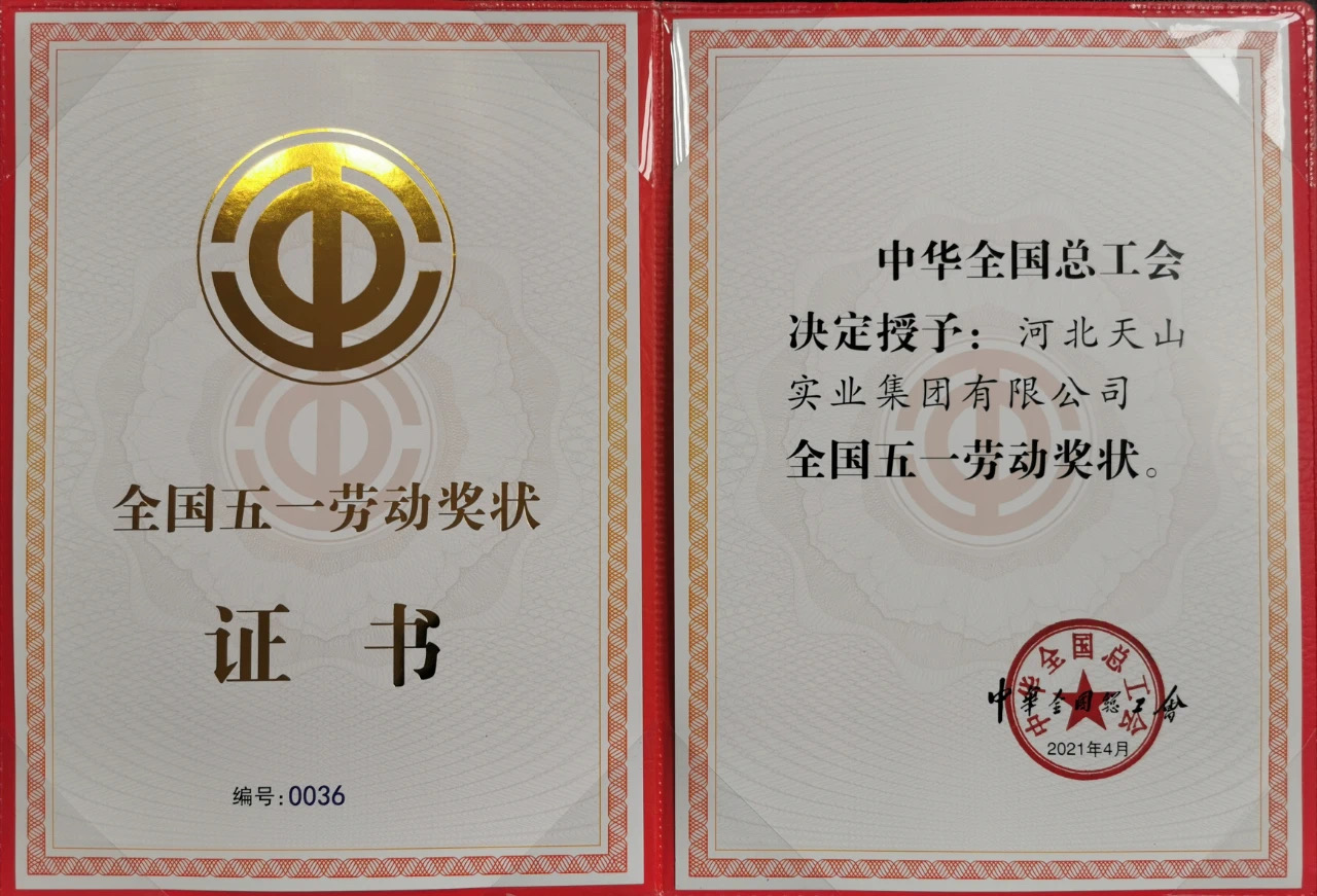 2021年7月13日,天山集团荣获“全国五一劳动奖状”授牌仪式隆重举行。中华全国总工会办公厅巡视员,督查室主任姜晓捷、石家庄市总工会副主席张宝山,经济部部长史跃华,石家庄高新区总工会主席于云川、部长张建东,以及全国总工会驻高新区总工会工作组景思詹、钟扬等领导一行应邀出席授牌仪式。天山集团党委书记、董事局主席吴振山、集团副总裁兼外事集团总裁王辉霞、集团综合办主任郑焕章、集团工会主席成国栋参加了授牌仪式。